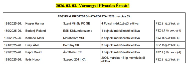 Három-három meccsre szóló eltiltást kapott az MLSZ Csongrád-Csanád vármegyei igazgatóságának fegyelmi bizottságától a Mórahalom-Bordány mérkőzésen kiállított két labdarúgó: a hazaiaktól Körmöci Márk, míg a bordányiaktól Heipl Ábel hiányzik majd három mérkőzésről. Egymeccses eltiltásban részesült Bodonji Roland (Kiskundorozsma) és Papdi Dávid (Ásotthalom) is. Íme a teljes határozati lista!