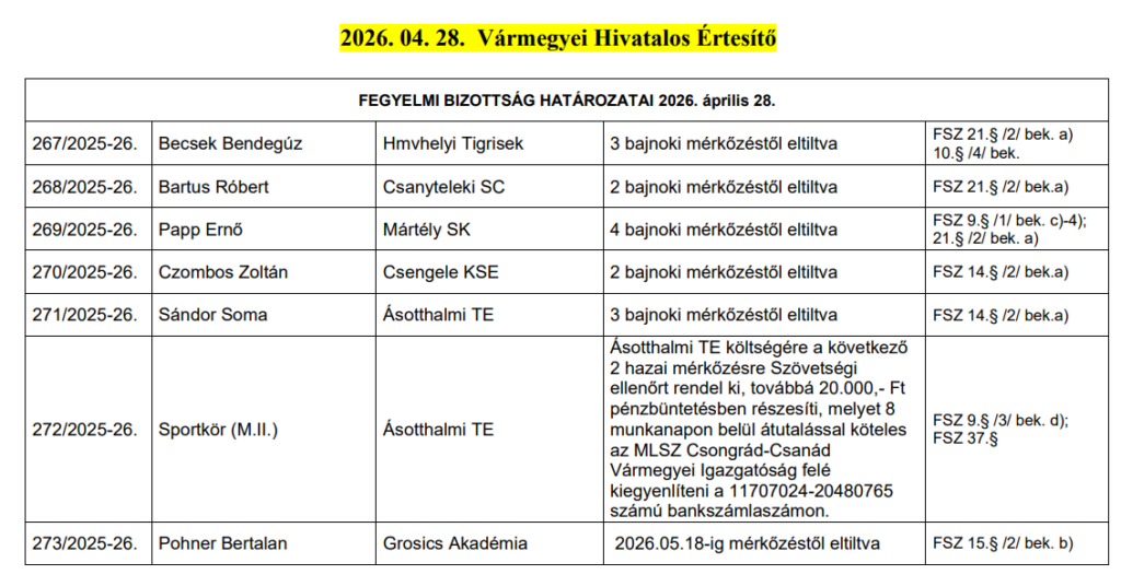A Csengele elleni meccsen állították ki a Mártély támadóját, Papp Ernőt: a megyekettő góllövőlistáját vezető csatárra négy mérkőzésre szóló eltiltást szabott ki az MLSZ Csongrád-Csanád vármegyei igazgatóságának fegyelmi bizottsága. Három meccsről hiányzik majd Becsek Bendegúz (Hódmezővásárhelyi TUS), valamint Sándor Soma (Ásotthalom) is, az ásotthalmiak két mérkőzésére pedig szövetségi ellenőrt rendeltek ki. Czombos Zoltán (Csengele) és Bartus Róbert (Csanytelek) is két-két meccsről hiányzik majd. Íme a teljes határozati lista!