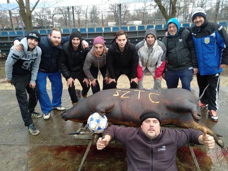 Közös disznóvágást tartottak a székkutasi sportpályán: a csapat tagjai és edzője, Horváth Zoltán közösen ölték le és dolgozták fel a malacot – amelynek bőrébe pörzsölés után az SZTC feliratot is beleírták.