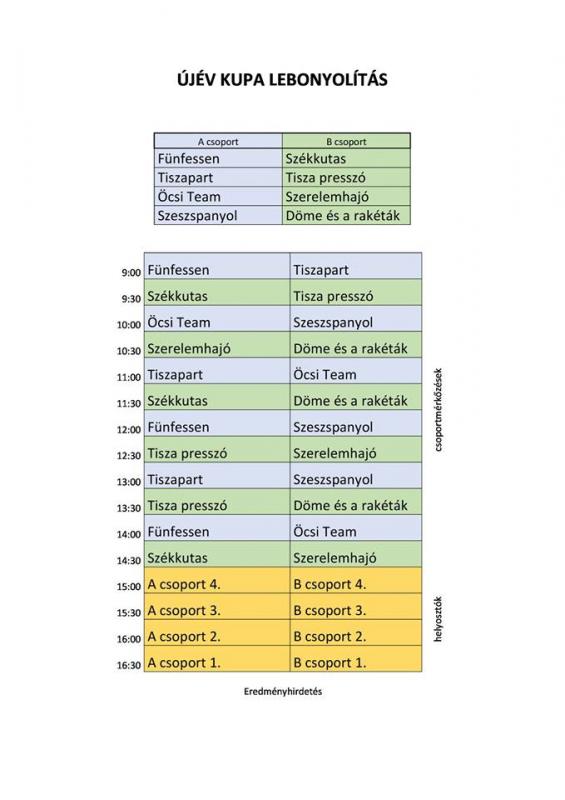 Két négycsapatos csoportban rendezik meg Csongrádon az Újév Kupát: a csoportmeccseket követően az azonos helyen végzők döntik el egymás ellen a végső helyezéseket, így a két negyedik a hetedik, a két harmadik az ötödik, a két második a harmadik, míg a két győztes az első helyért játszhat a nap végén. Íme a beosztás és a program.